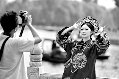一位身着古装的游客在北京什刹海进行旅拍。光明图片/IC Photo